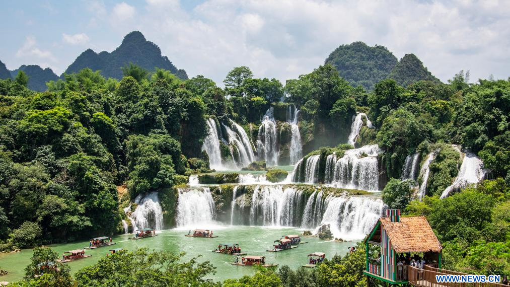 BEIJING, 3 juin (Xinhua) -- Des touristes s'amusent aux bords de la cascade de Detian dans le district de Daxin, à Chongzuo, dans la région autonome Zhuang du Guangxi (sud), le 1er juin 2025.