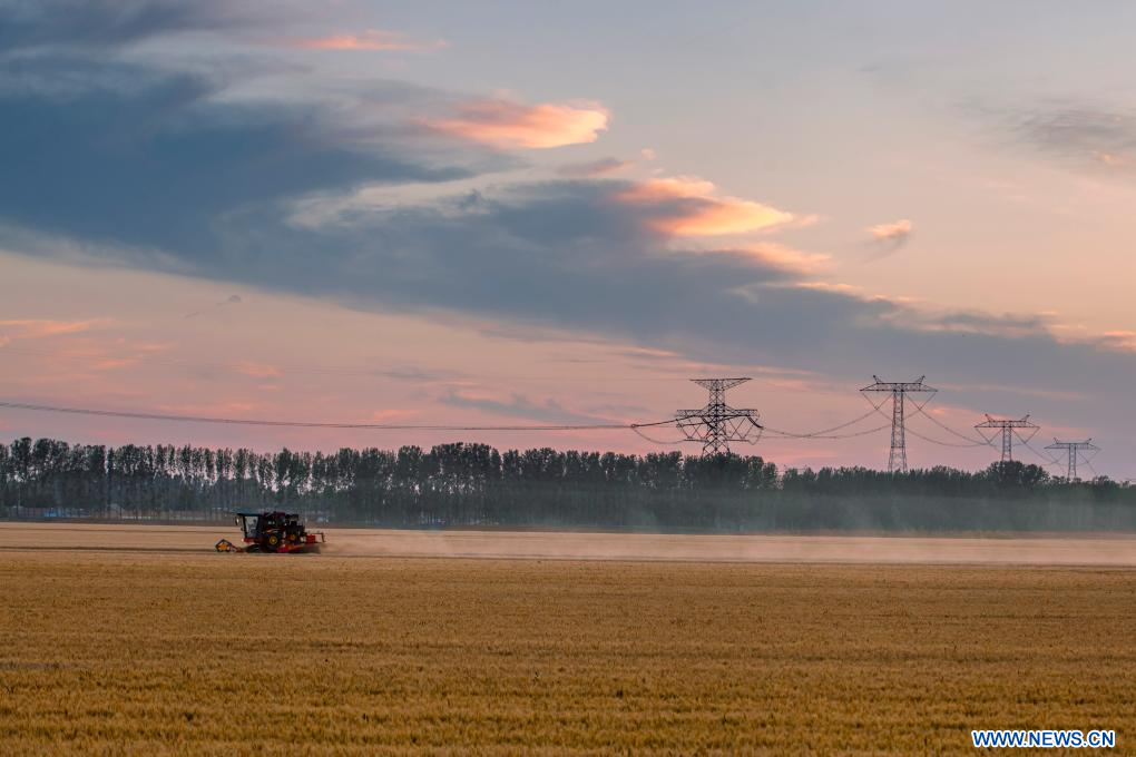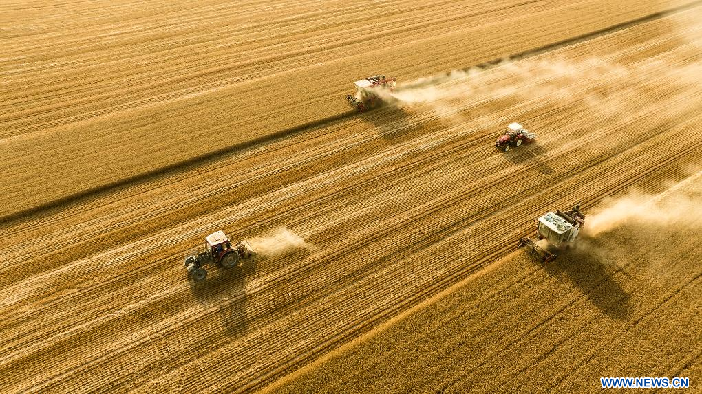BEIJING, 7 juin (Xinhua) -- Photo de moissonneuses en pleine activité dans les champs à Pantang, village de la ville de Shangqiu, dans la province chinoise du Henan (centre), le 4 juin 2025. (Photo : Li Heng)