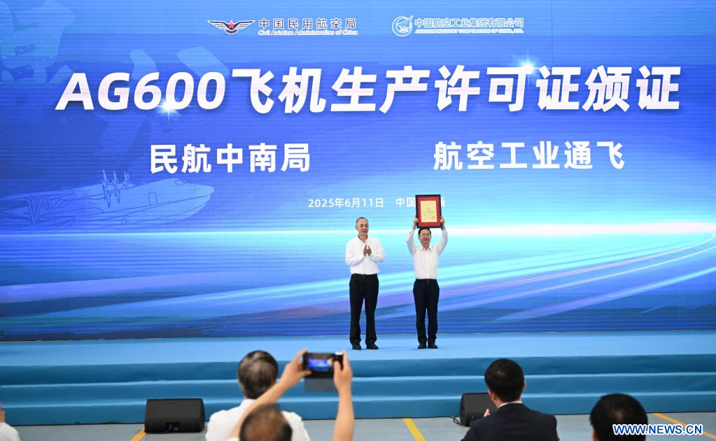 BEIJING, 11 juin (Xinhua) -- L'avion amphibie AG600 "Kunlong", développé indépendamment par la Chine, est officiellement entré en production de masse après avoir reçu mercredi le certificat de production de l'Administration de l'aviation civile de Chine. Fin
