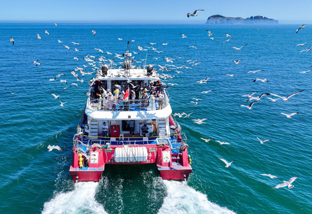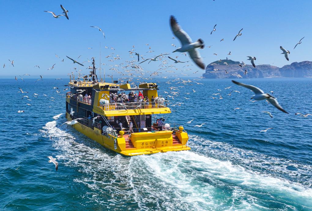 RONGCHENG, 23 juin (Xinhua) -- Photo aérienne de touristes profitant d'une excursion en bateau à Rongcheng, ville de la province chinoise du Shandong (est), le 23 juin 2025. (Photo : Li Xinjun)