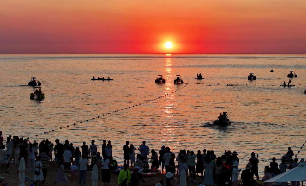 WEIHAI, 23 juin (Xinhua) -- Des touristes profitent du coucher du soleil sur la plage de la ville de Weihai, dans la province chinoise du Shandong (est), le 22 juin 2025. (Photo : Zhu Chunxiao)