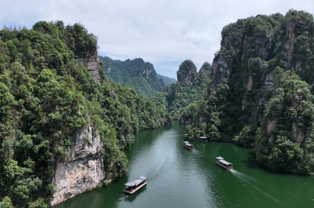 ZHANGJIAJIE, 23 juin (Xinhua) -- Photo aérienne de touristes prenant des bateaux pour faire une promenade touristique sur le lac Baofeng dans l'arrondissement de Wulingyuan à Zhangjiajie, dans la province chinoise du Hunan (centre), le 16 juin 2025. (Photo : Wu Yongbing)