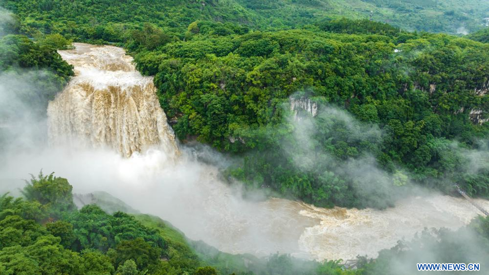 En raison de pluies persistantes, la cascade de Huangguoshu a atteint jeudi son débit maximal de la saison des crues cette année, avec un flux de 528 mètres cubes par seconde. (Photo : Chen Xi)