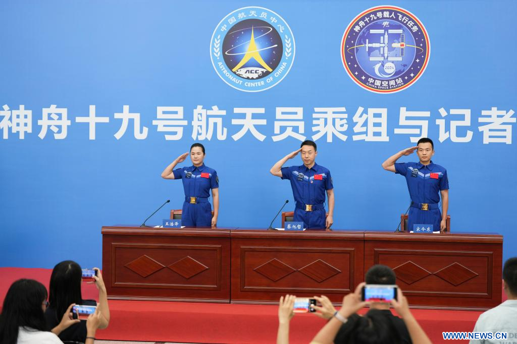 BEIJING, 9 juillet (Xinhua) -- Les trois astronautes de la mission chinoise Shenzhou-19 ont rencontré la presse mercredi. Il s'agit de leur première apparition publique après leur retour sur Terre en avril. Fin