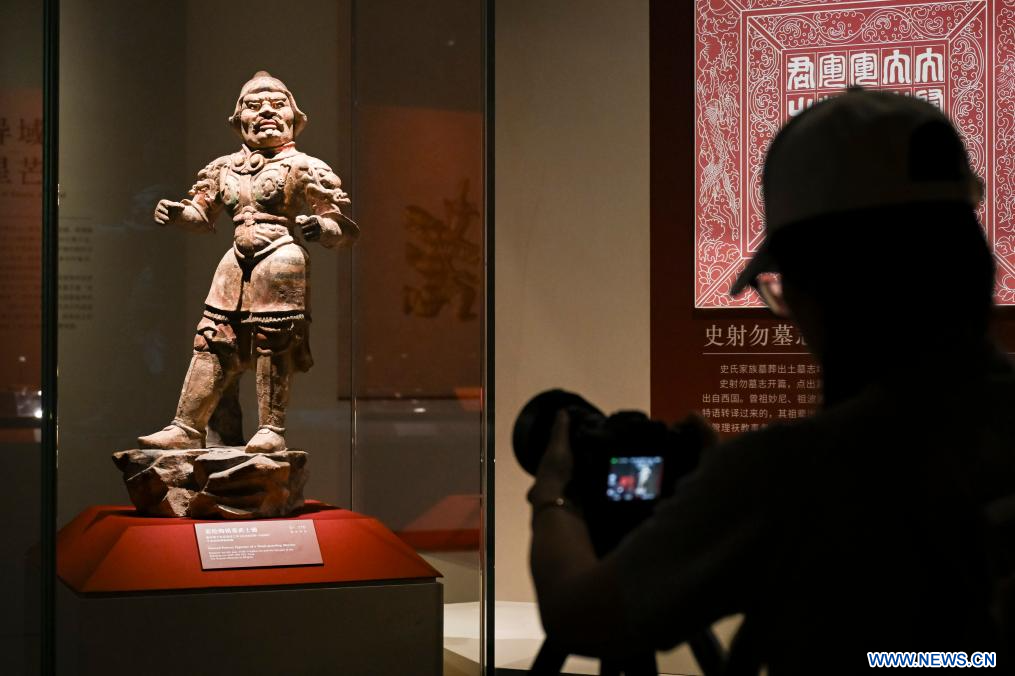 SHANGHAI, 9 juillet (Xinhua) -- Un professionnel des médias photographie une statuette de guerrier présentée lors d'une exposition de reliques culturelles au Musée de Shanghai Est, à Shanghai, dans l'est de la Chine, le 8 juillet 2025. Cette exposition, qui présente plus de 300 reliques culturelles provenant de la ville de Guyuan, dans la région autonome Hui du Ningxia (nord-ouest de la Chine), a ouvert ses portes à Shanghai mardi. (Photo : Chen Haoming)
