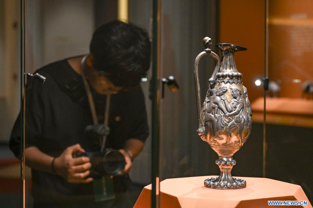 SHANGHAI, 9 juillet (Xinhua) -- Un professionnel des médias photographie un vase en argent présenté lors d'une exposition de reliques culturelles au Musée de Shanghai Est, à Shanghai, dans l'est de la Chine, le 8 juillet 2025. Cette exposition, qui présente plus de 300 reliques culturelles provenant de la ville de Guyuan, dans la région autonome Hui du Ningxia (nord-ouest de la Chine), a ouvert ses portes à Shanghai mardi. (Photo : Chen Haoming)