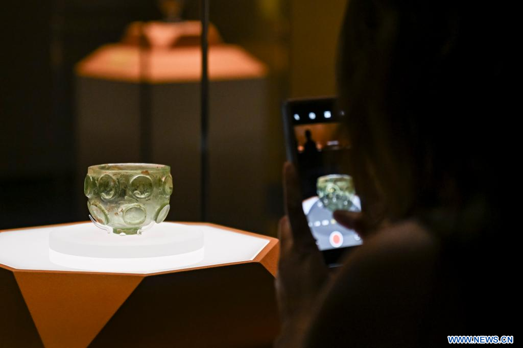 SHANGHAI, 9 juillet (Xinhua) -- Un professionnel des médias photographie un bol en verre présenté lors d'une exposition de reliques culturelles au Musée de Shanghai Est, à Shanghai, dans l'est de la Chine, le 8 juillet 2025. Cette exposition, qui présente plus de 300 reliques culturelles provenant de la ville de Guyuan, dans la région autonome Hui du Ningxia (nord-ouest de la Chine), a ouvert ses portes à Shanghai mardi. (Photo : Chen Haoming)