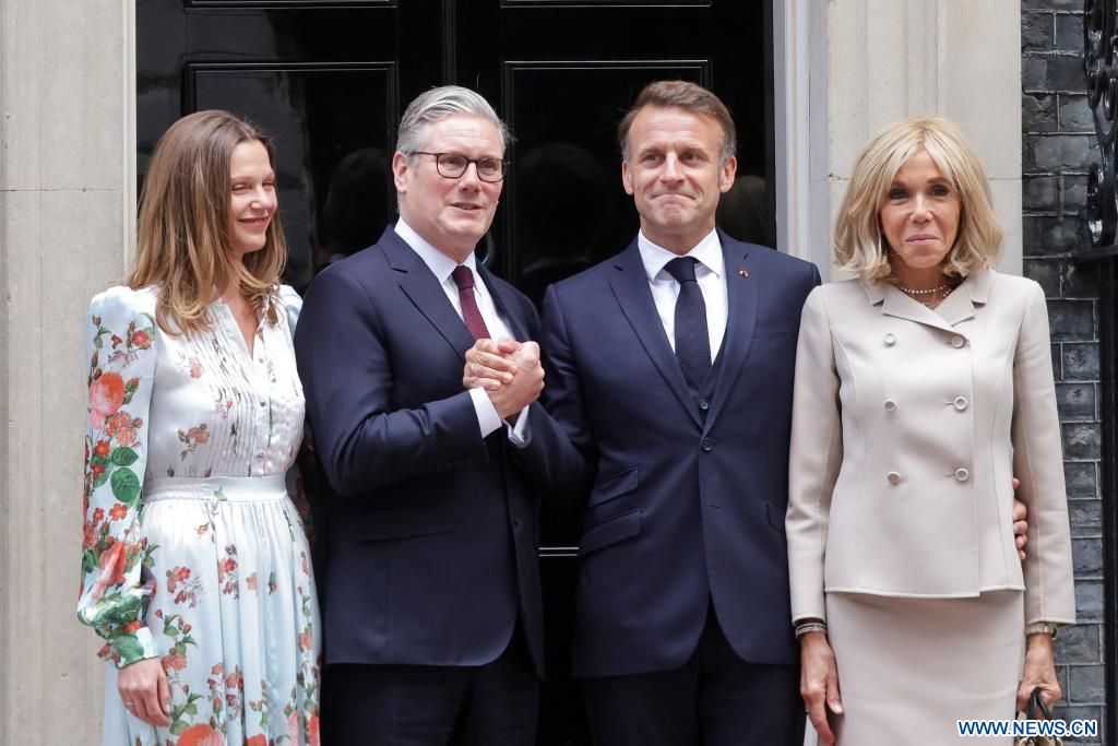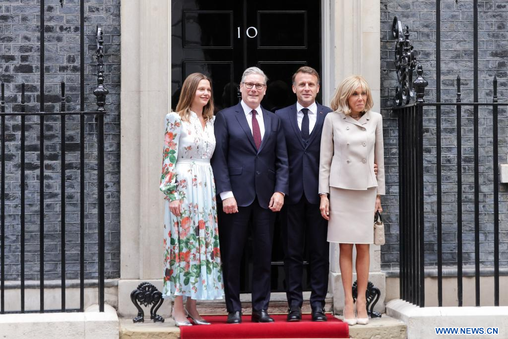 LONDRES, 9 juillet (Xinhua) -- Le Premier ministre britannique Keir Starmer (2e à gauche) et son épouse Victoria Starmer (1ère à gauche) accueillent le président français Emmanuel Macron (2e à droite) et son épouse Brigitte Macron au 10 Downing Street à Londres, au Royaume-Uni, le 9 juillet 2025. M. Starmer a rencontré M. Macron mercredi à Downing Street, alors que les deux parties se sont engagées à sévir conjointement contre l'immigration illégale. (Xinhua)