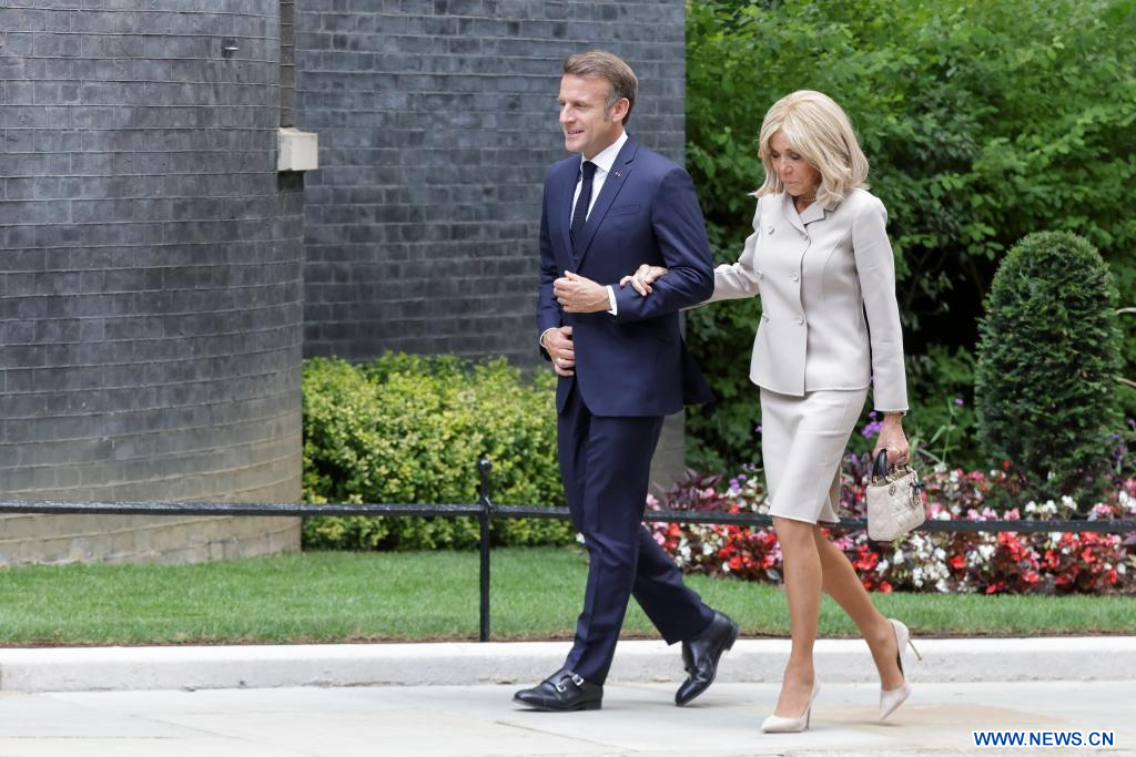 LONDRES, 9 juillet (Xinhua) -- Le président français Emmanuel Macron et son épouse Brigitte Macron arrivent au 10 Downing Street à Londres, au Royaume-Uni, le 9 juillet 2025. Le Premier ministre britannique Keir Starmer a rencontré M. Macron mercredi à Downing Street, alors que les deux parties se sont engagées à sévir conjointement contre l'immigration illégale. (Xinhua)