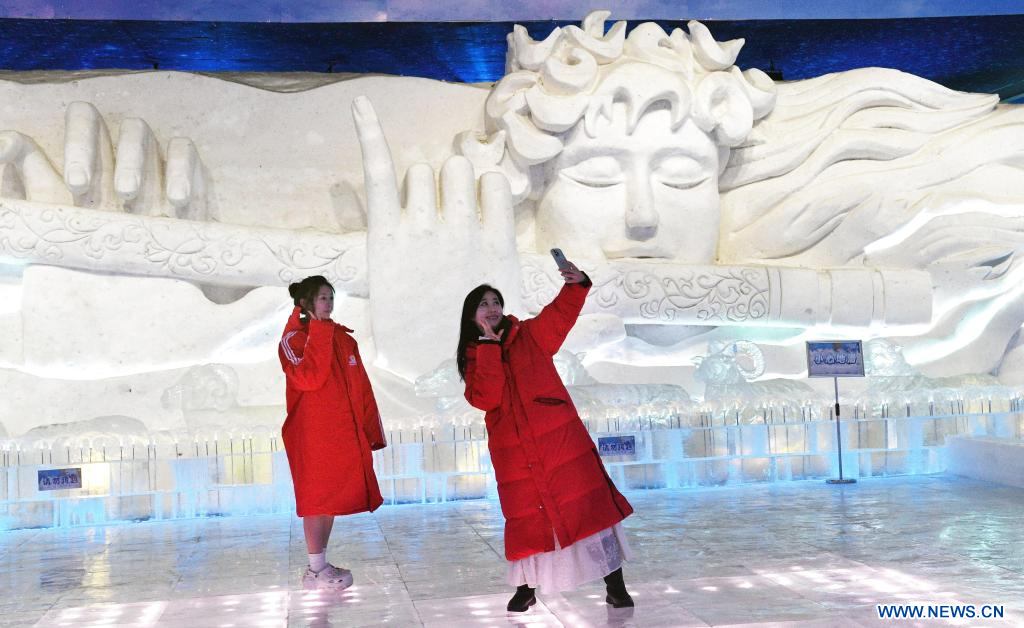 HARBIN, 10 juillet (Xinhua) -- Des touristes prennent des photos devant une sculpture de neige dans la galerie d'art de glace et de neige du site touristique de l'île du Soleil, à Harbin, dans la province chinoise du Heilongjiang (nord-est), le 9 juillet 2025.