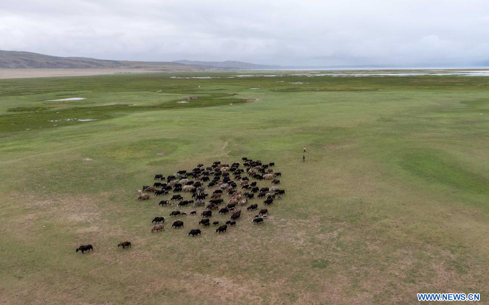 LHASSA, 23 juillet (Xinhua) -- Photo aérienne prise par drone le 22 juillet 2025 montrant un troupeau de yaks dans une zone humide près du lac Mapam Yumco dans le district de Burang de la préfecture de Ngari, dans la région autonome du Xizang (sud-ouest de la Chine). (Photo : Tenzing Nima Qadhup)