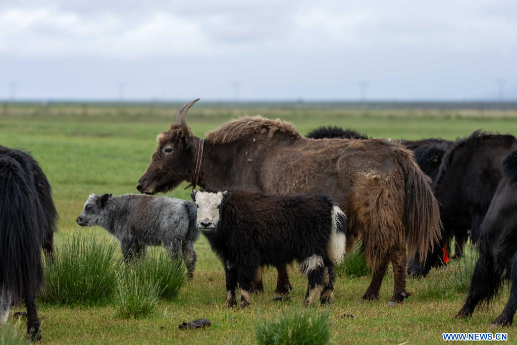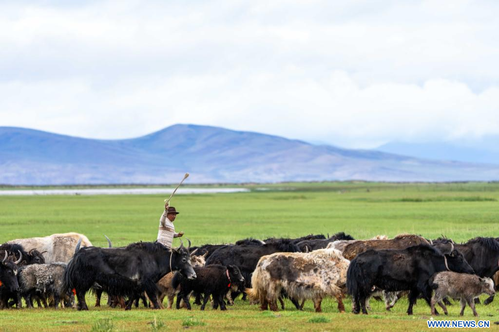 LHASSA, 23 juillet (Xinhua) -- Photo prise le 22 juillet 2025 montrant un troupeau de yaks dans une zone humide près du lac Mapam Yumco dans le district de Burang de la préfecture de Ngari, dans la région autonome du Xizang (sud-ouest de la Chine). (Photo : Tenzing Nima Qadhup)
