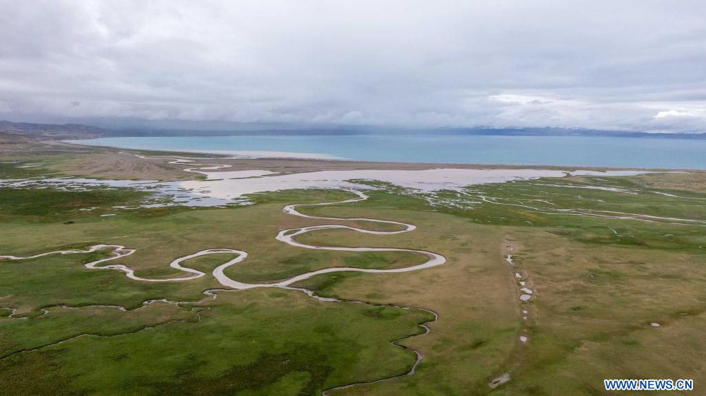 LHASSA, 23 juillet (Xinhua) -- Photo aérienne prise par drone le 22 juillet 2025 montrant le paysage d'une zone humide près du lac Mapam Yumco dans le district de Burang de la préfecture de Ngari, dans la région autonome du Xizang (sud-ouest de la Chine). (Photo : Tenzing Nima Qadhup)