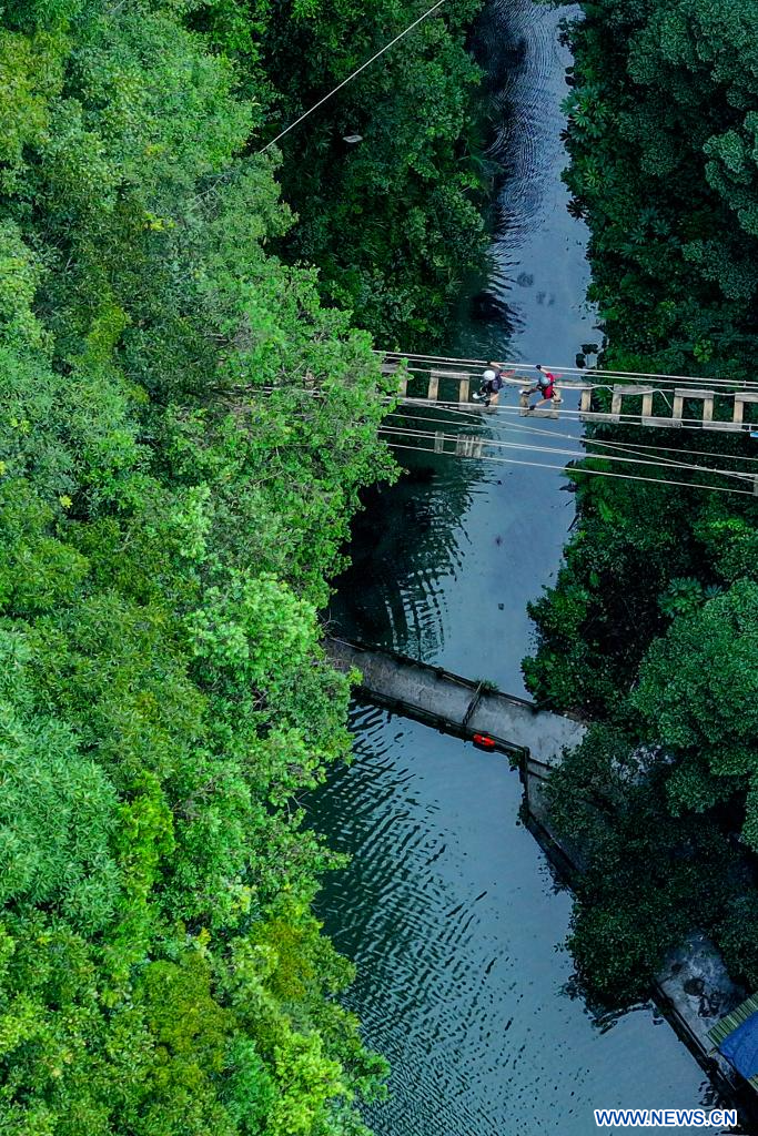 GUIZHOU, 24 juillet (Xinhua) -- Photo aérienne prise par drone le 22 juillet 2025 montrant des touristes traversant un pont suspendu dans une doline géante située dans le district de Kaiyang, dans la province chinoise du Guizhou (sud-ouest).