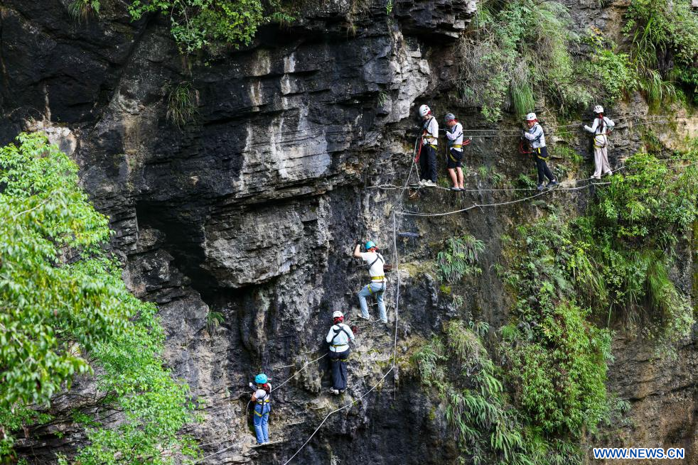 GUIZHOU, 24 juillet (Xinhua) -- Des touristes profitent d'un espace d'escalade dans une doline géante dans le district de Kaiyang, dans la province chinoise du Guizhou (sud-ouest), le 22 juillet 2025.