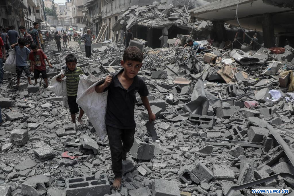 GAZA, 9 août (Xinhua) -- Des enfants marchent au milieu de décombres après une frappe aérienne israélienne dans le quartier d'Al-Rimal, à l'ouest de la ville de Gaza, le 8 août 2025. (Xinhua/Rizek Abdeljawad)