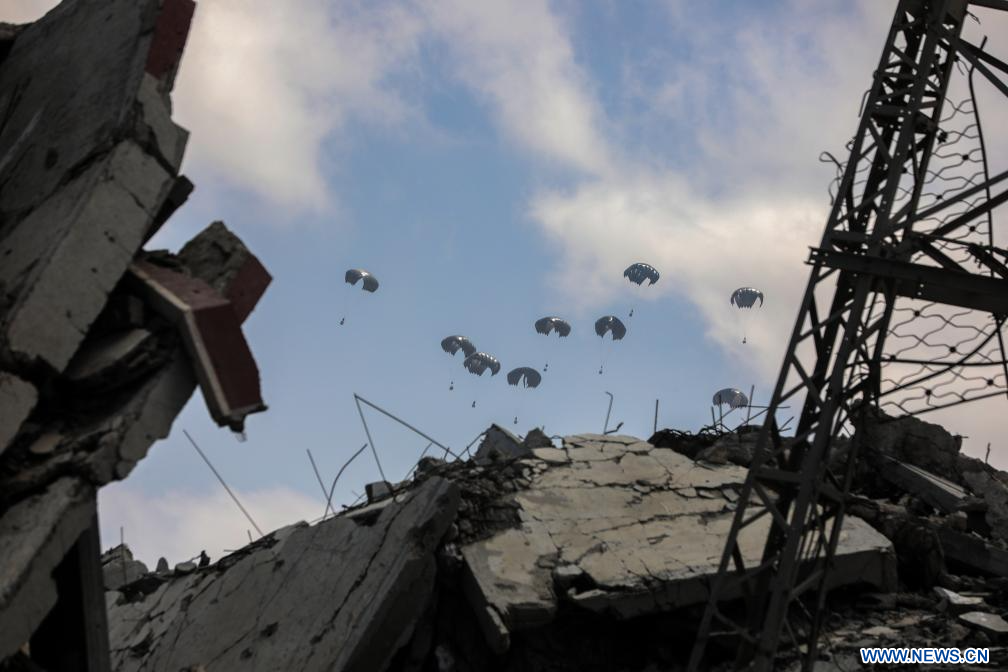 GAZA, 9 août (Xinhua) -- Des colis d'aide humanitaire ont été largués sur la ville de Gaza, le 8 août 2025. (Xinhua/Rizek Abdeljawad)
