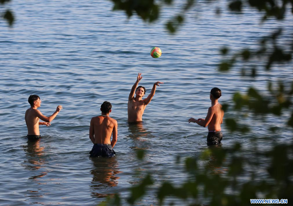ROME, 12 août (Xinhua) -- Des personnes jouent au volley-ball au lac Bracciano en Italie, le 9 août 2025. Les Italiens profitent de diverses activités pendant la saison estivale. (Xinhua/Li Jing)
