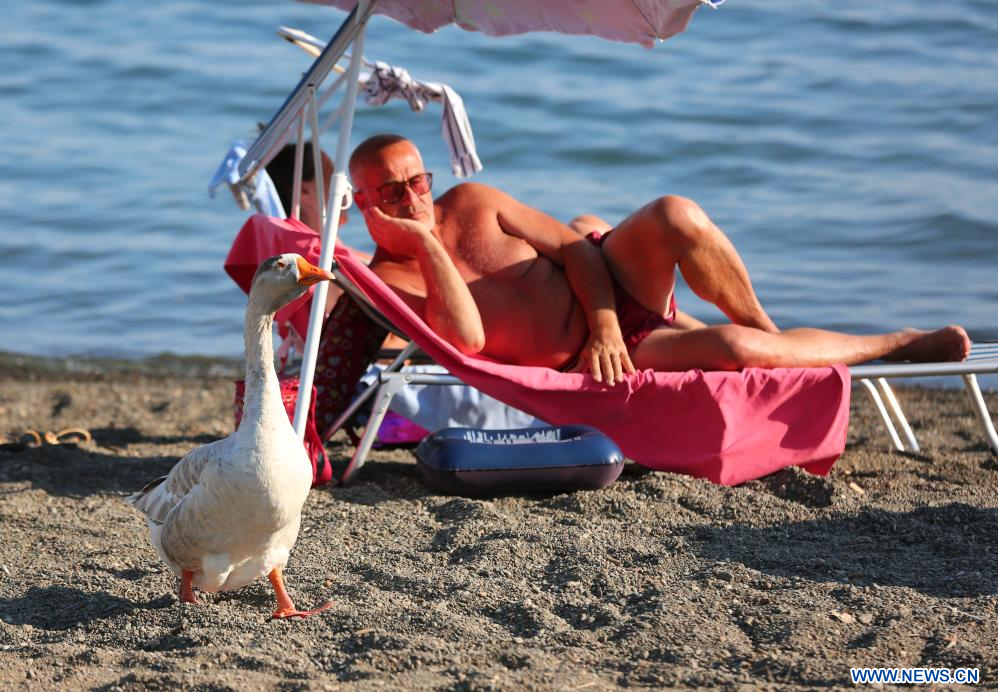 ROME, 12 août (Xinhua) -- Une oie se promène sur la plage du lac Bracciano en Italie, le 9 août 2025. Les Italiens profitent de diverses activités pendant la saison estivale. (Xinhua/Li Jing)