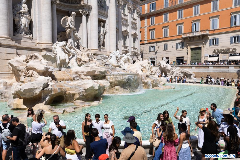 ROME, 12 août (Xinhua) -- Des touristes visitent la fontaine de Trevi à Rome, en Italie, le 7 août 2025. Les Italiens profitent de diverses activités pendant la saison estivale. (Xinhua/Li Jing)