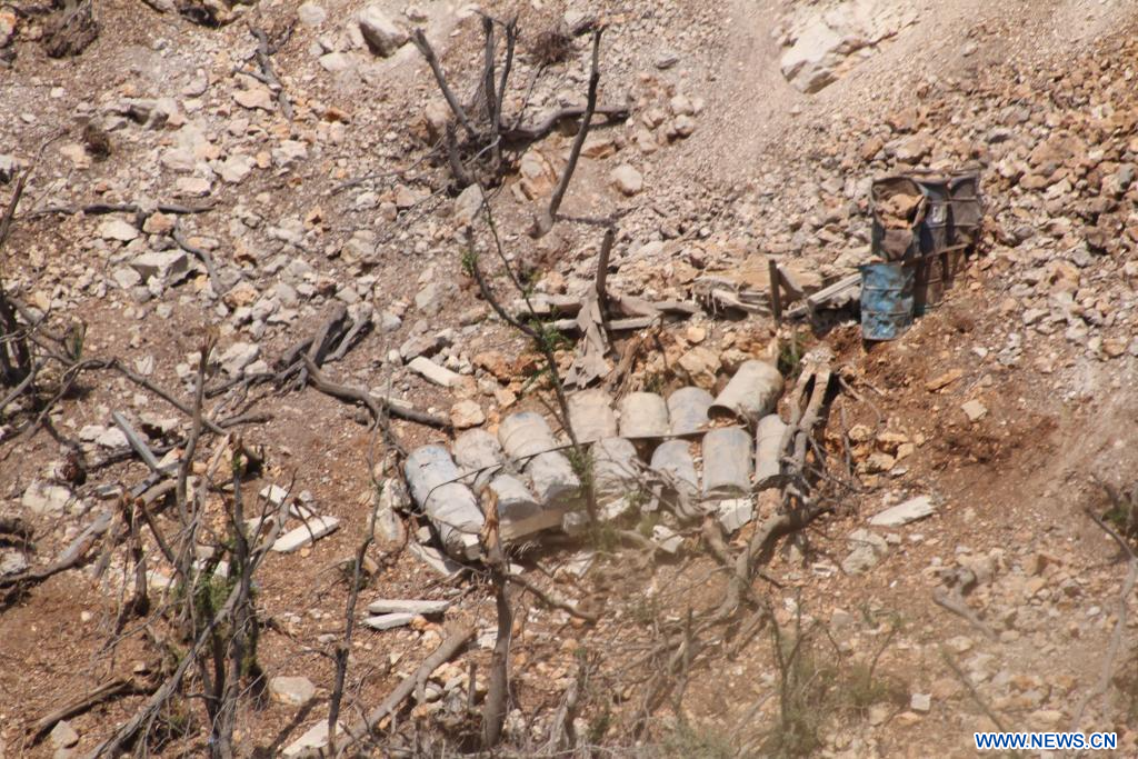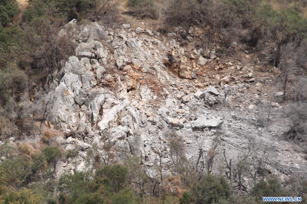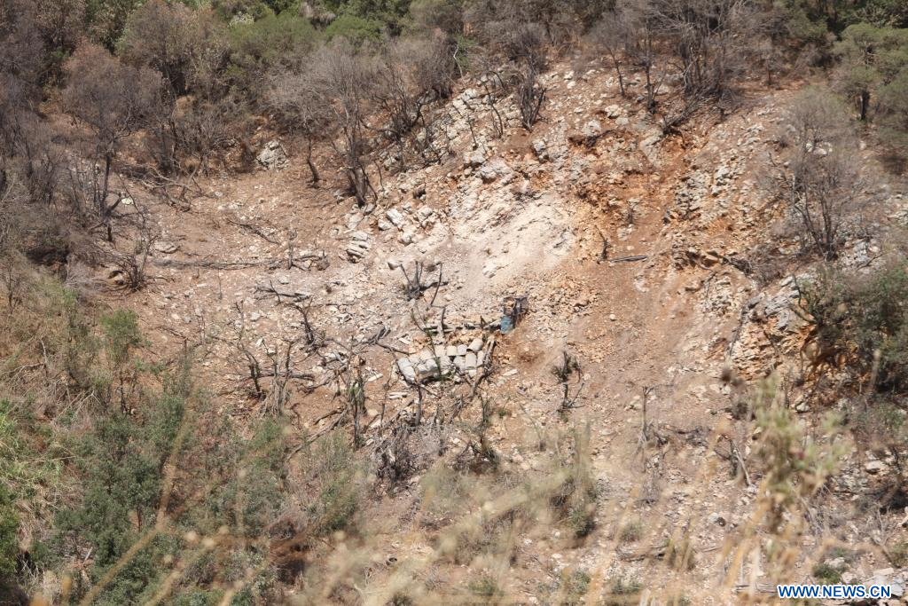 NABATIEH, 22 août (Xinhua) -- Photo prise le 21 août 2025 montrant les destructions causées plus tôt dans la journée par des frappes aériennes israéliennes visant des tunnels militaires appartenant au Hezbollah, dans les environs de Nabatieh, au Liban. (Xinhua/Taher Abu Hamdan)