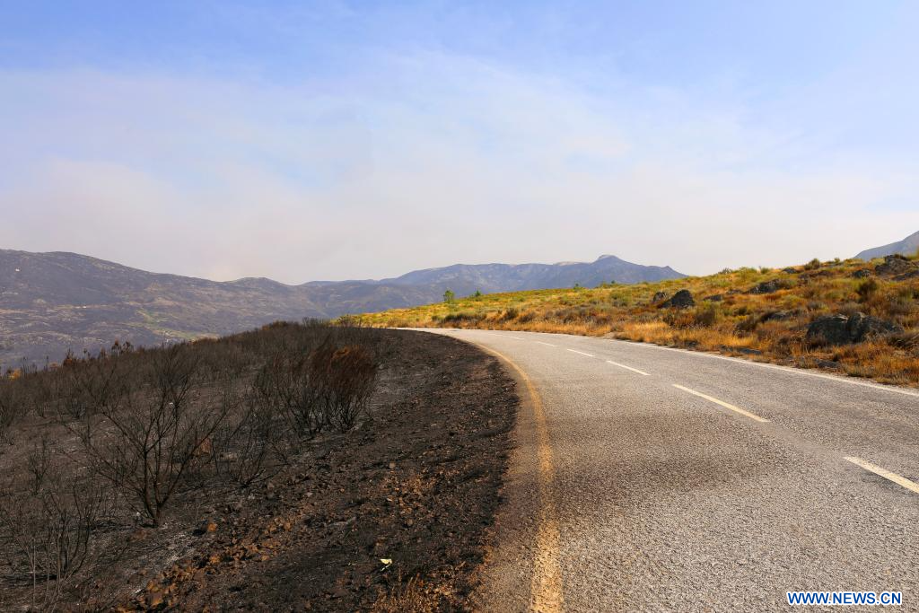 Photo montrant les montagnes ravagées par les incendies près d'Unhais da Serra, au Portugal, le 23 août 2025. (Xinhua/Xun Wei)