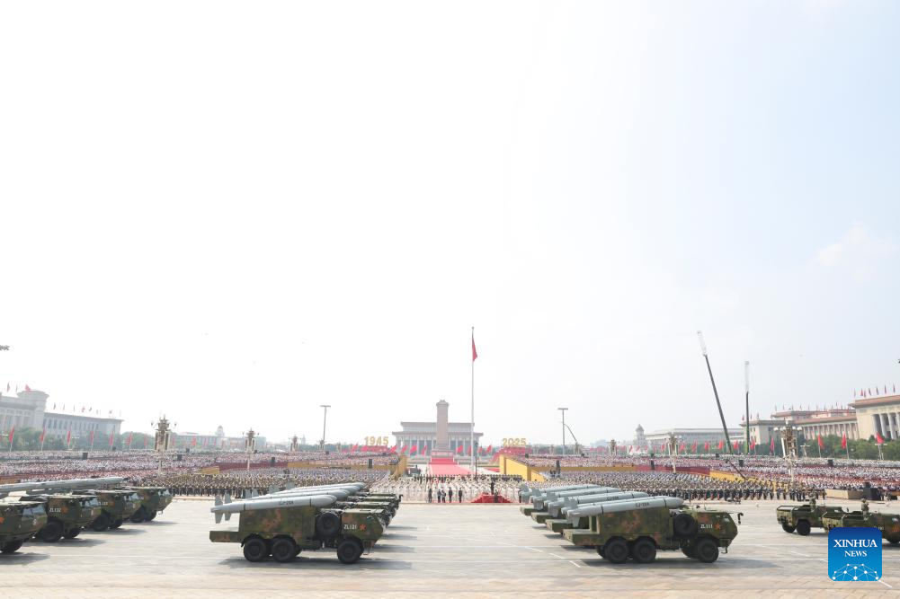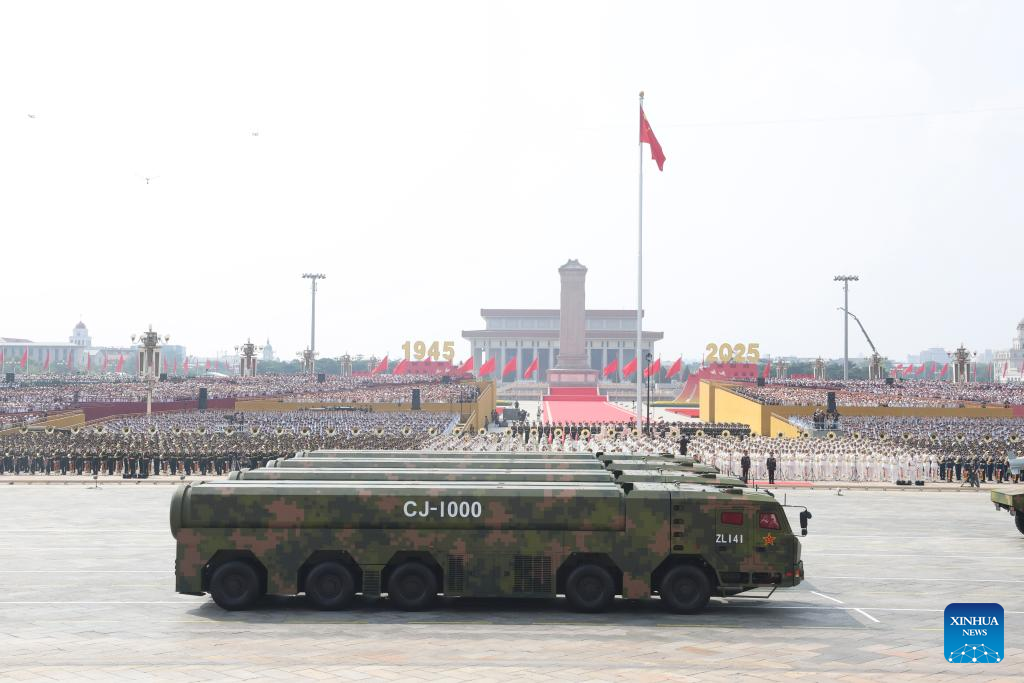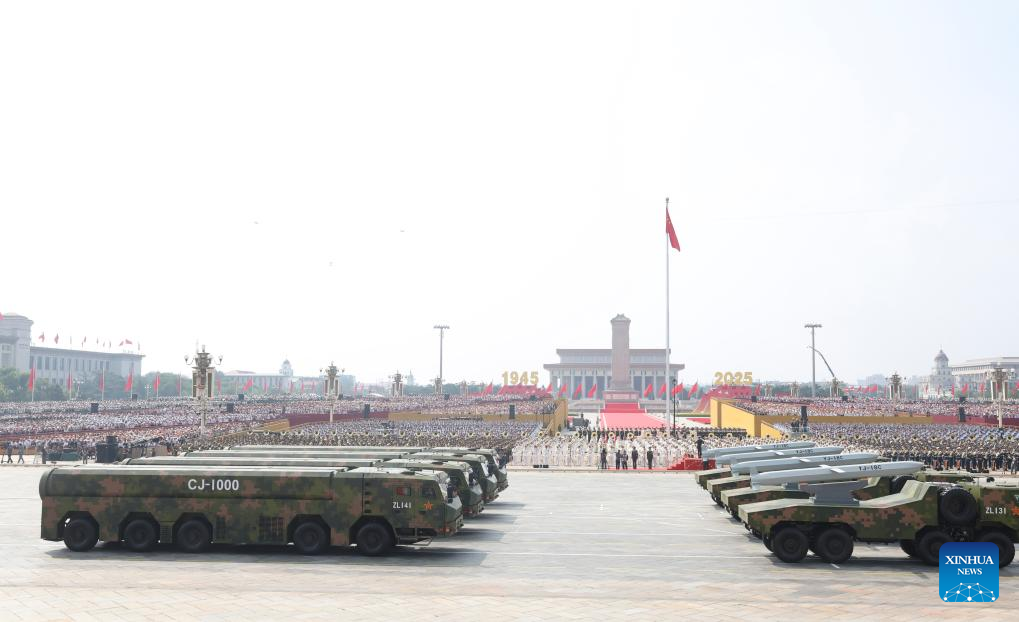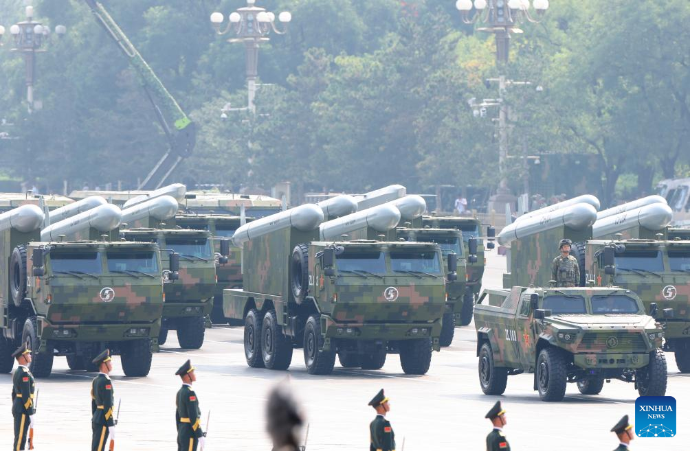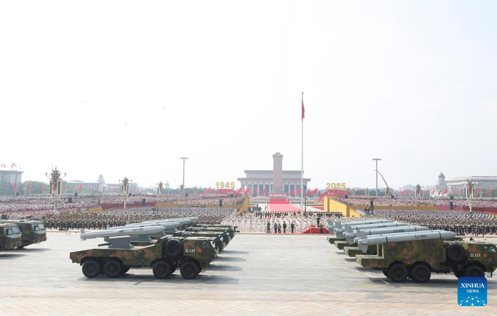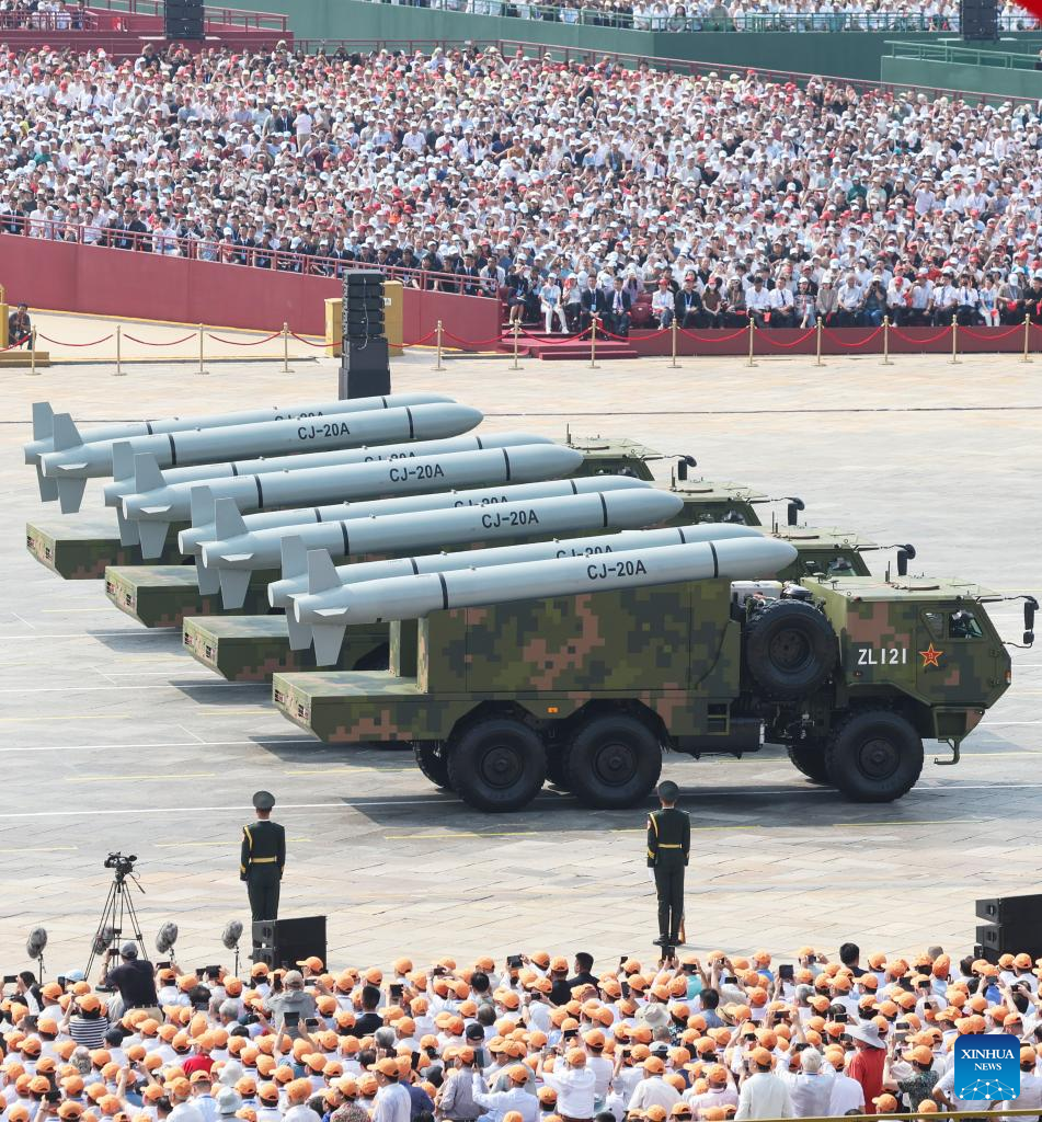 BEIJING, 3 septembre (Xinhua) -- La Chine a dévoilé mercredi, lors du défilé militaire organisé à l'occasion de la Journée de la Victoire, ses missiles de croisière ChangJian-20A, YingJi-18C et ChangJian-1000, afin de présenter ses capacités de frappe précise à longue portée et de dissuasion multidomaine.