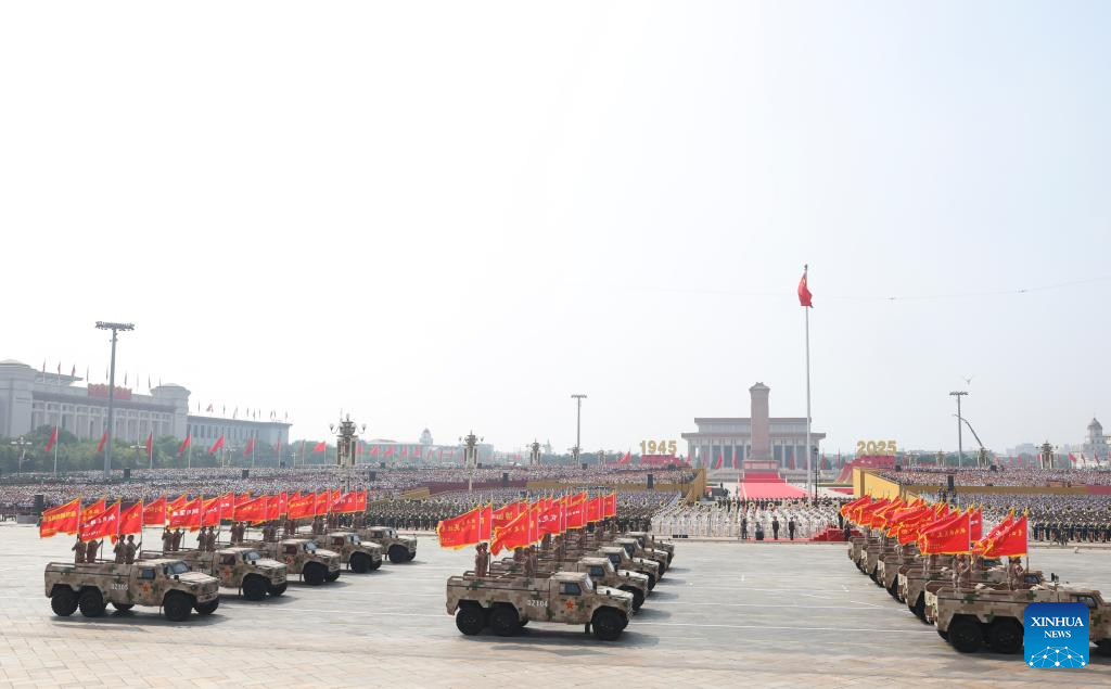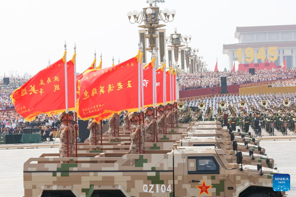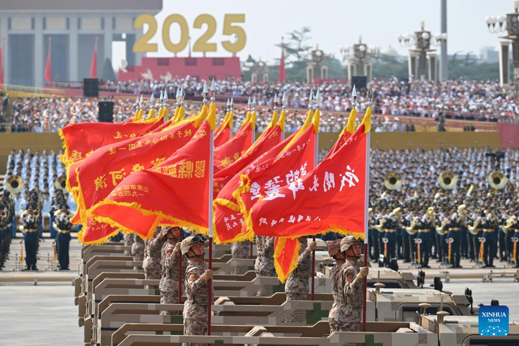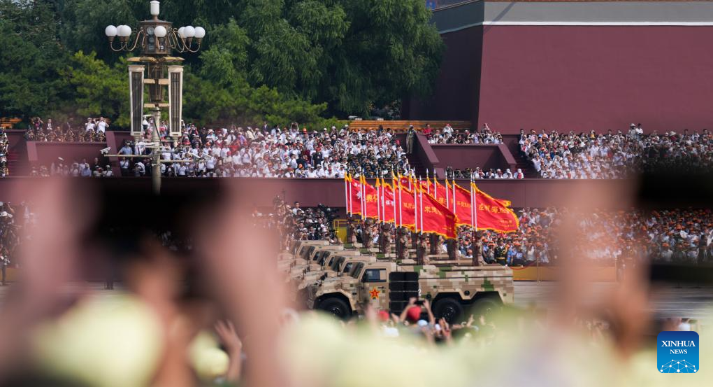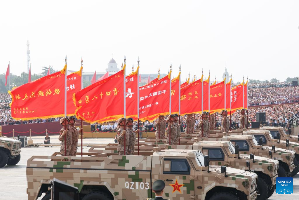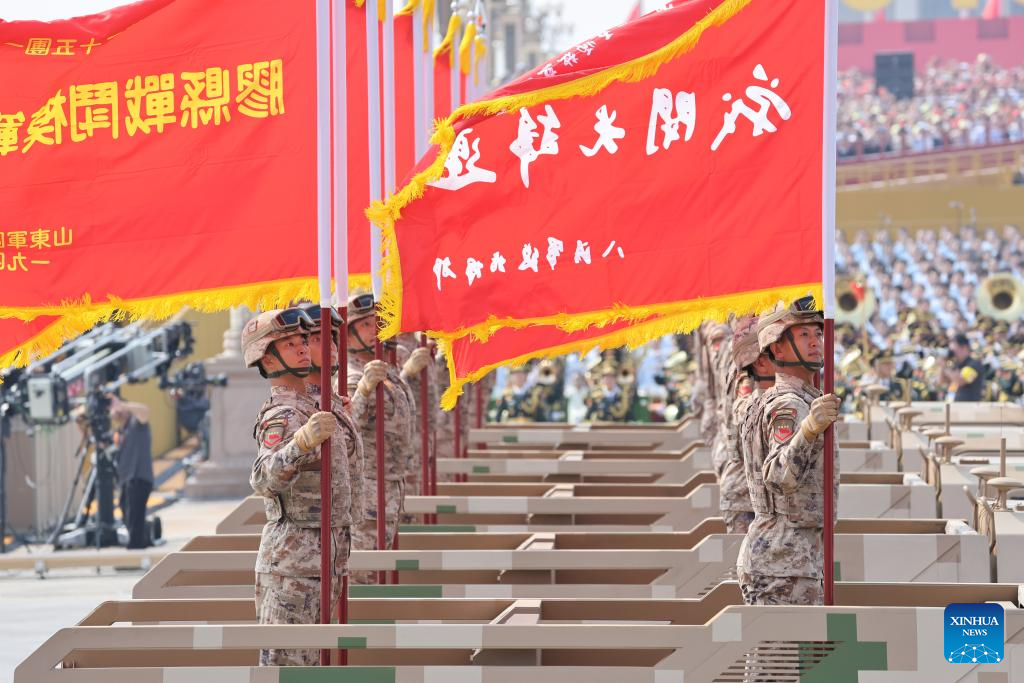 BEIJING, 3 septembre (Xinhua) -- La formation des drapeaux de guerre a présenté mercredi 80 drapeaux d'honneur des troupes héroïques de la guerre de résistance contre l'agression japonaise lors du défilé militaire de la Journée de la Victoire, portant ainsi la gloire du passé. Fin