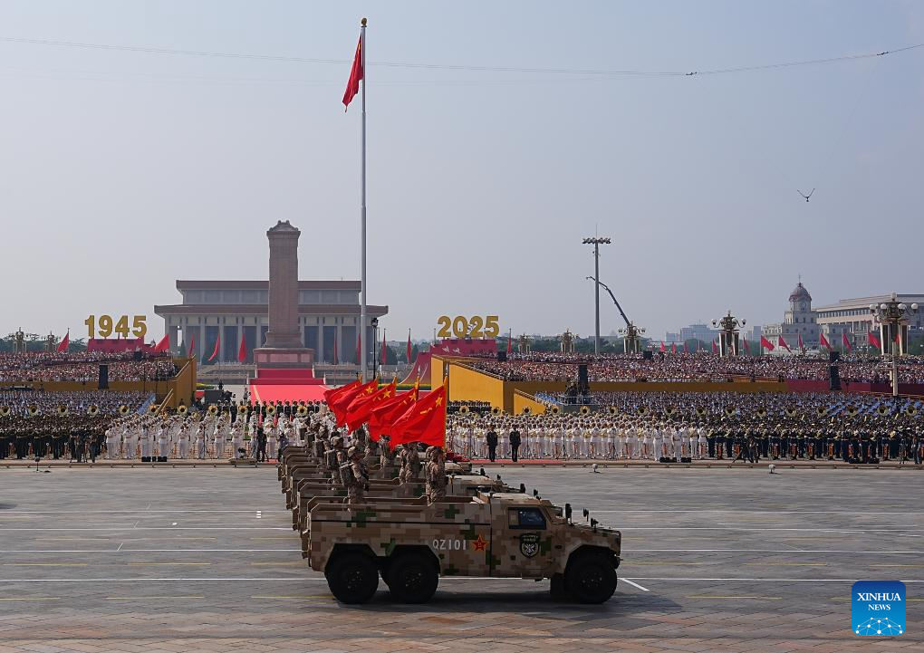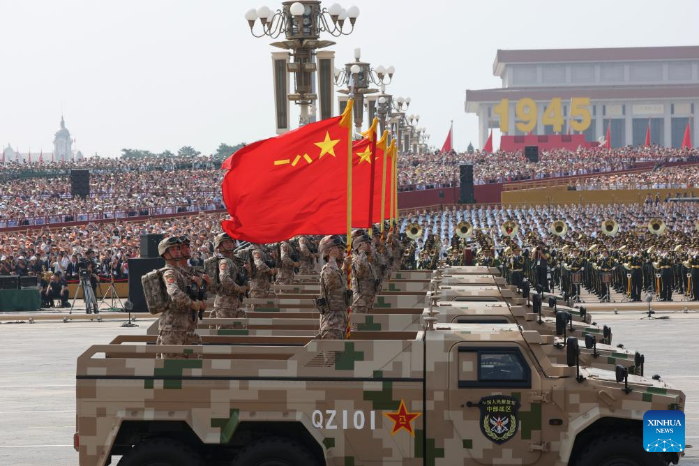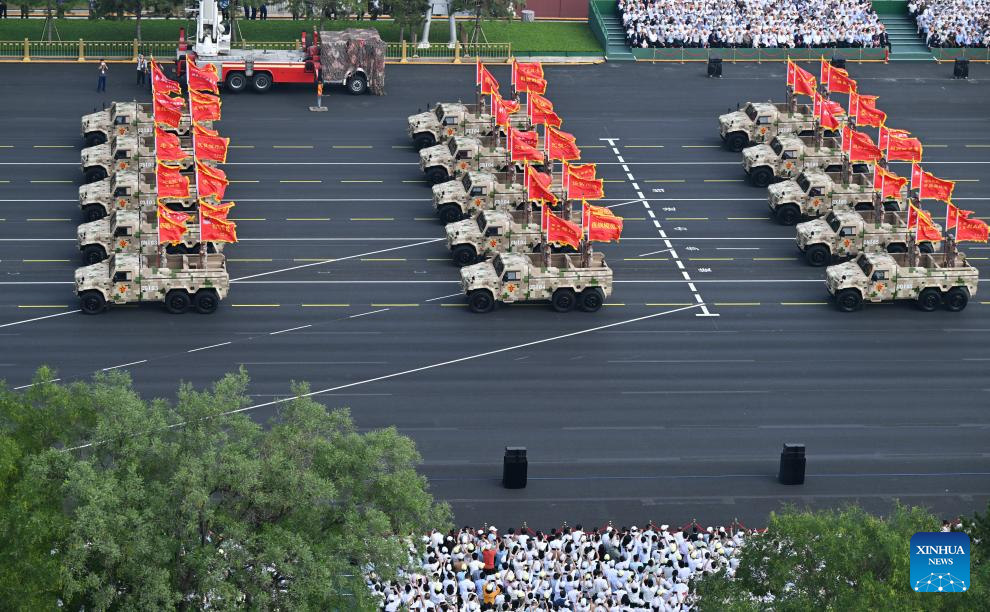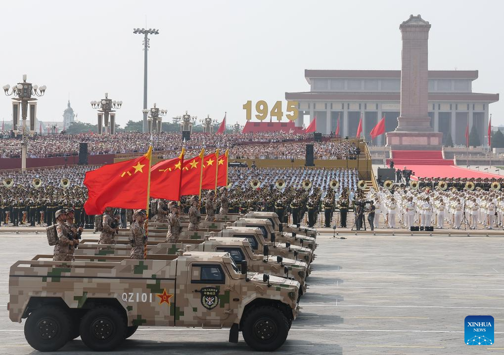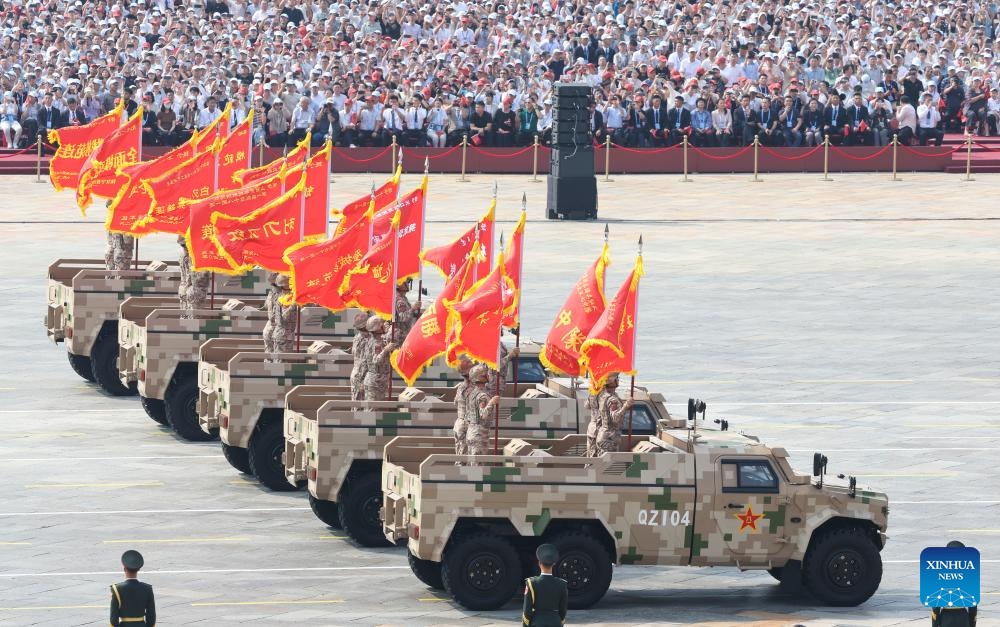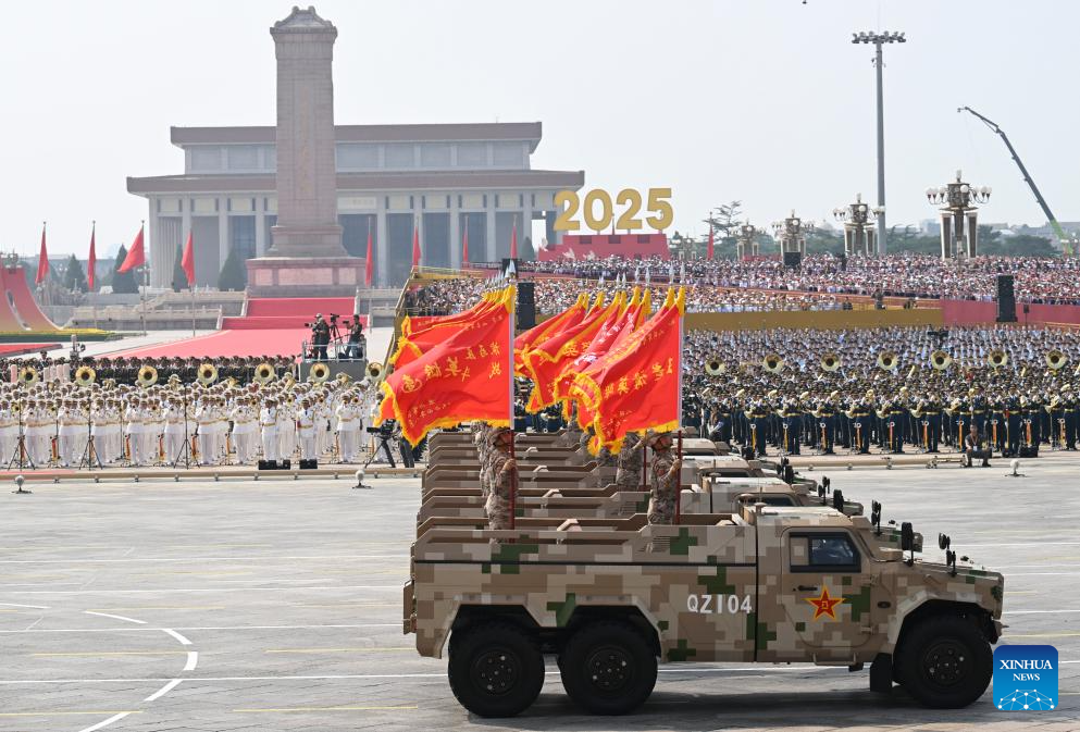 BEIJING, 3 septembre (Xinhua) -- La formation des drapeaux de guerre a présenté mercredi 80 drapeaux d'honneur des troupes héroïques de la guerre de résistance contre l'agression japonaise lors du défilé militaire de la Journée de la Victoire, portant ainsi la gloire du passé. Fin