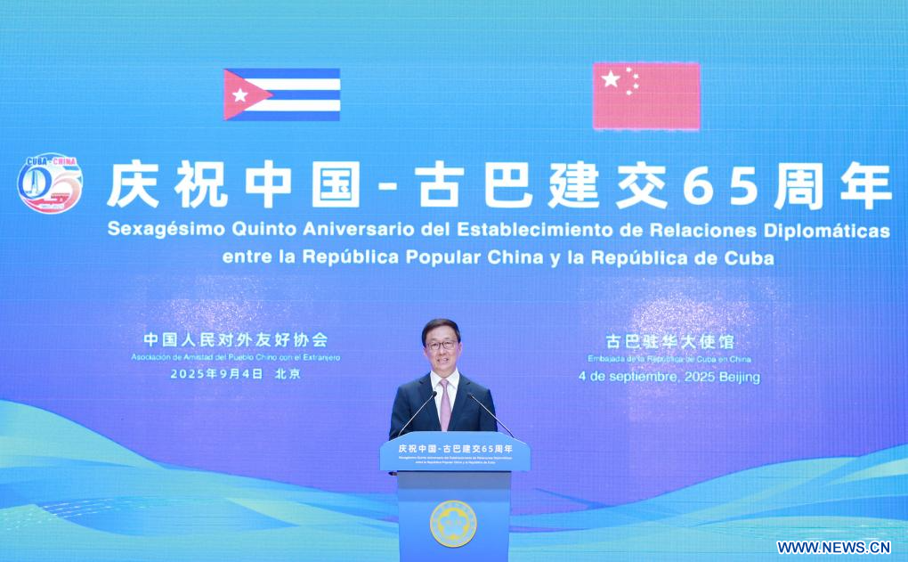 BEIJING, 4 septembre (Xinhua) -- Le vice-président chinois Han Zheng et le président cubain Miguel Diaz-Canel ont assisté jeudi à Beijing à une cérémonie célébrant le 65e anniversaire de l'établissement des relations diplomatiques entre la Chine et Cuba.