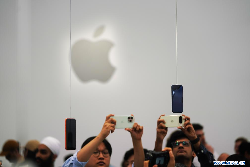 SAN FRANCISCO, 10 septembre (Xinhua) -- Des personnes prennent des photos des nouveaux produits Apple après leur lancement à Cupertino en Californie, aux Etats-Unis, le 9 septembre 2025. Apple a annoncé mardi une série de nouveaux iPhones et d'écouteurs sans fil, dont l'iPhone 17, le tout nouvel iPhone Air et les AirPods Pro 3. (Xinhua/Wu Xiaoling)