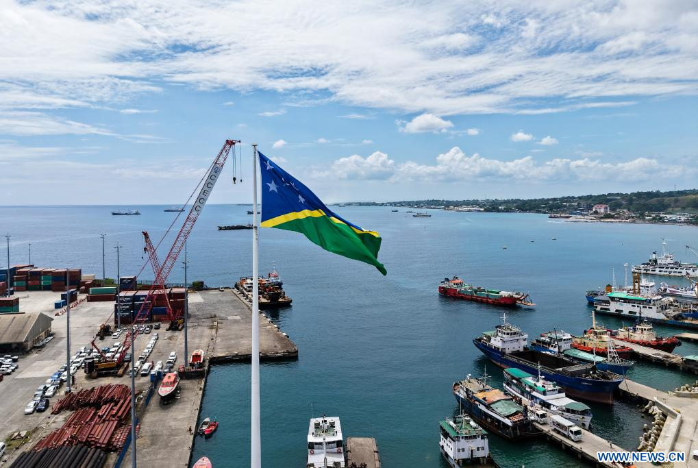 HONIARA, 12 septembre (Xinhua) -- Photo aérienne prise par drone le 8 septembre 2025 montre un port à Honiara, dans les Îles Salomon. (Xinhua/Ma Ping)