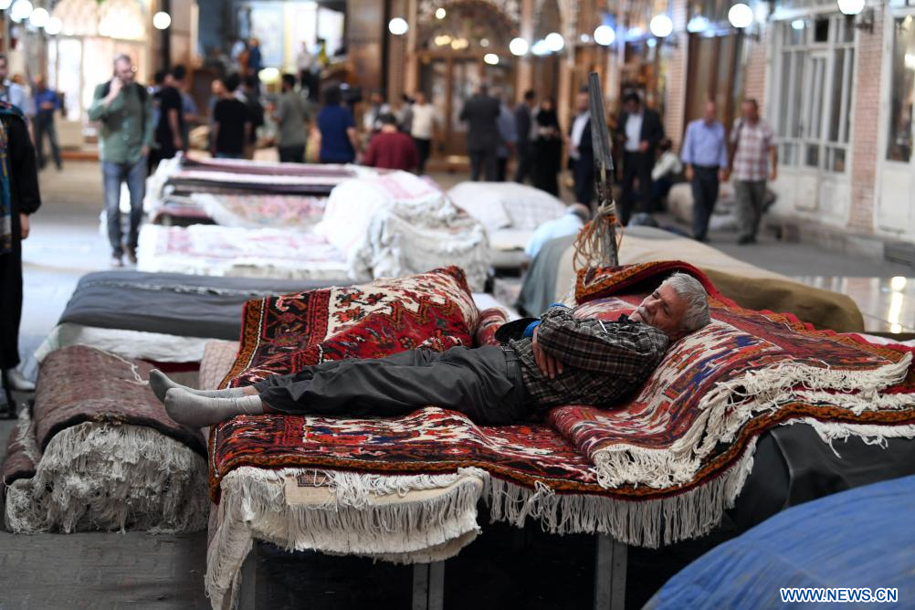 TABRIZ (Iran), 19 septembre (Xinhua) -- Un vendeur de tapis se repose dans le bazar historique de Tabriz, dans la ville du même nom située dans le nord-ouest de l'Iran, le 17 septembre 2025. Le complexe du bazar historique de Tabriz a été inscrit au patrimoine mondial de l'UNESCO. (Xinhua/Sha Dati)