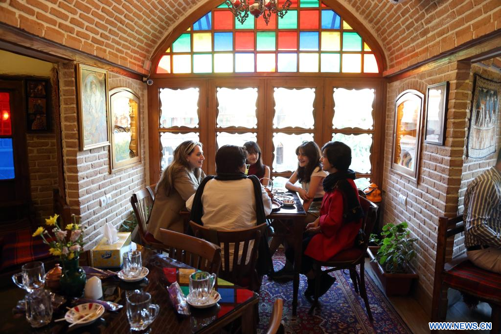 TABRIZ (Iran), 20 septembre (Xinhua) -- Des femmes profitent de leur temps libre dans un restaurant du bazar historique de Tabriz, dans la ville du même nom située dans le nord-ouest de l'Iran, le 17 septembre 2025. Le complexe du bazar historique de Tabriz a été inscrit au patrimoine mondial de l'UNESCO. (Xinhua/Sha Dati)