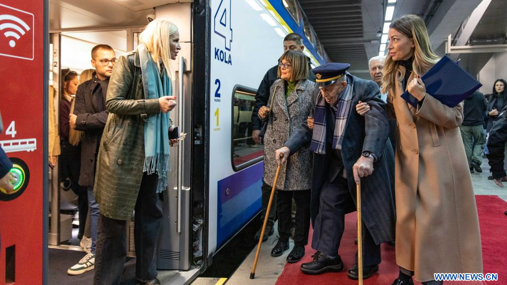 SUBOTICA (Serbie), 4 octobre (Xinhua) -- Des gens accompagnent un homme serbe de 105 ans pour monter à bord du train de la ligne ferroviaire à grande vitesse Hongrie-Serbie, à Belgrade, en Serbie, le 3 octobre 2025.