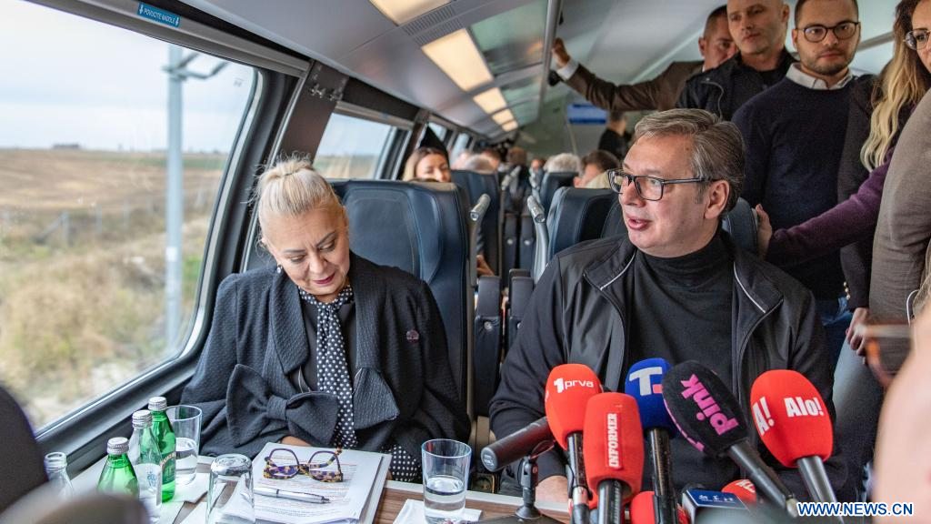 SUBOTICA (Serbie), 4 octobre (Xinhua) -- Le président serbe Aleksandar Vucic (à droite) prend place à bord du train reliant Belgrade à Subotica, une section de la ligne ferroviaire à grande vitesse Hongrie-Serbie, en Serbie, le 3 octobre 2025.