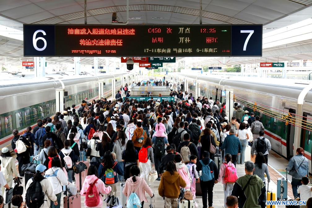 BEIJING, 5 octobre (Xinhua) -- Le flux interrégional de passagers en Chine a atteint un niveau historique pendant la première moitié des huit jours de vacances de la Fête nationale et de la Fête de la mi-automne, avec environ 1,24 milliard de voyages enregistrés, soulignant la vitalité d'un secteur des voyages robuste, a déclaré dimanche le ministère des Transports.