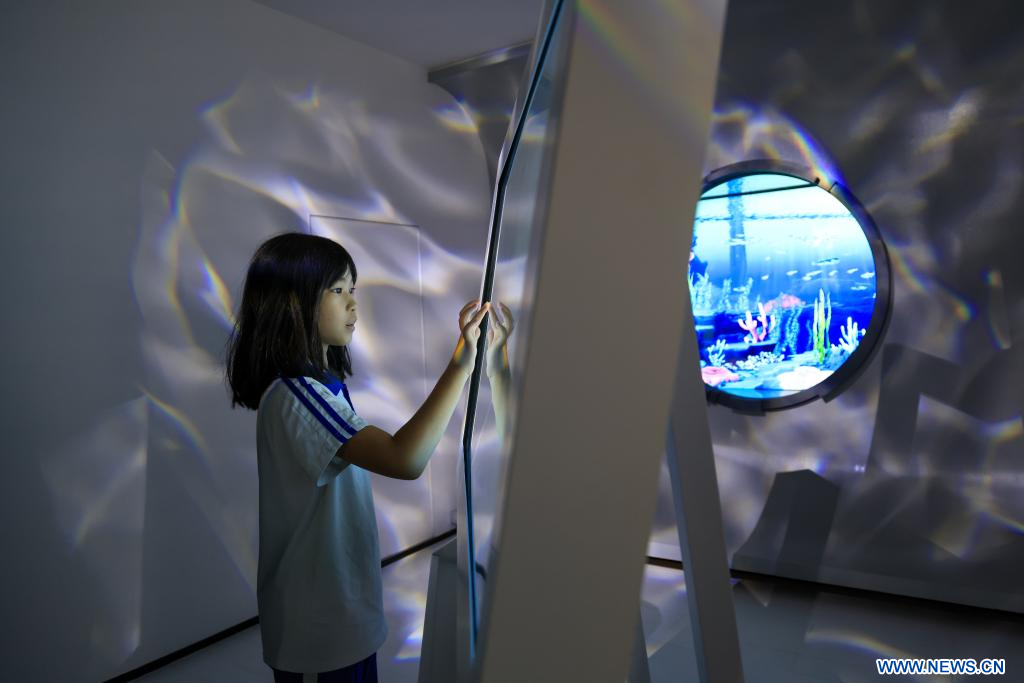 SHENZHEN, 26 octobre (Xinhua) -- Une jeune fille visite un centre de vulgarisation scientifique sur les passages maritimes de la zone de la Grande Baie Guangdong-Hong Kong-Macao, situé sur l'île artificielle ouest de la liaison Shenzhen-Zhongshan, dans la province du Guangdong, dans le sud de la Chine, le 25 octobre 2025. L'île artificielle ouest de la liaison Shenzhen-Zhongshan a ouvert samedi à titre d'essai à des fins touristiques.