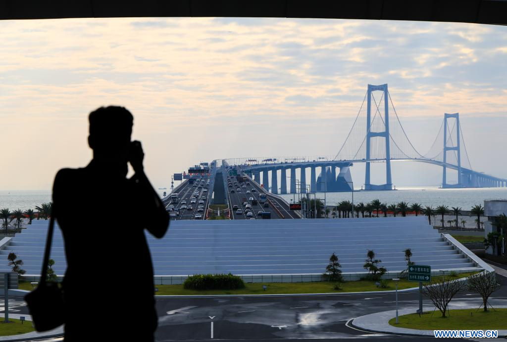 SHENZHEN, 26 octobre (Xinhua) -- Des gens prennent des photos du pont Shenzhong depuis une plate-forme d'observation située sur l'île artificielle ouest de la liaison Shenzhen-Zhongshan, dans la province du Guangdong, dans le sud de la Chine, le 25 octobre 2025. L'île artificielle ouest de la liaison Shenzhen-Zhongshan a ouvert samedi à titre d'essai à des fins touristiques.