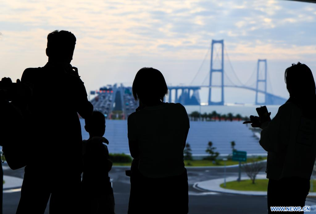 SHENZHEN, 26 octobre (Xinhua) -- Des gens visitent un centre de vulgarisation scientifique sur les passages maritimes de la zone de la Grande Baie Guangdong-Hong Kong-Macao, situé sur l'île artificielle ouest de la liaison Shenzhen-Zhongshan, dans la province du Guangdong, dans le sud de la Chine, le 25 octobre 2025. L'île artificielle ouest de la liaison Shenzhen-Zhongshan a ouvert samedi à titre d'essai à des fins touristiques.