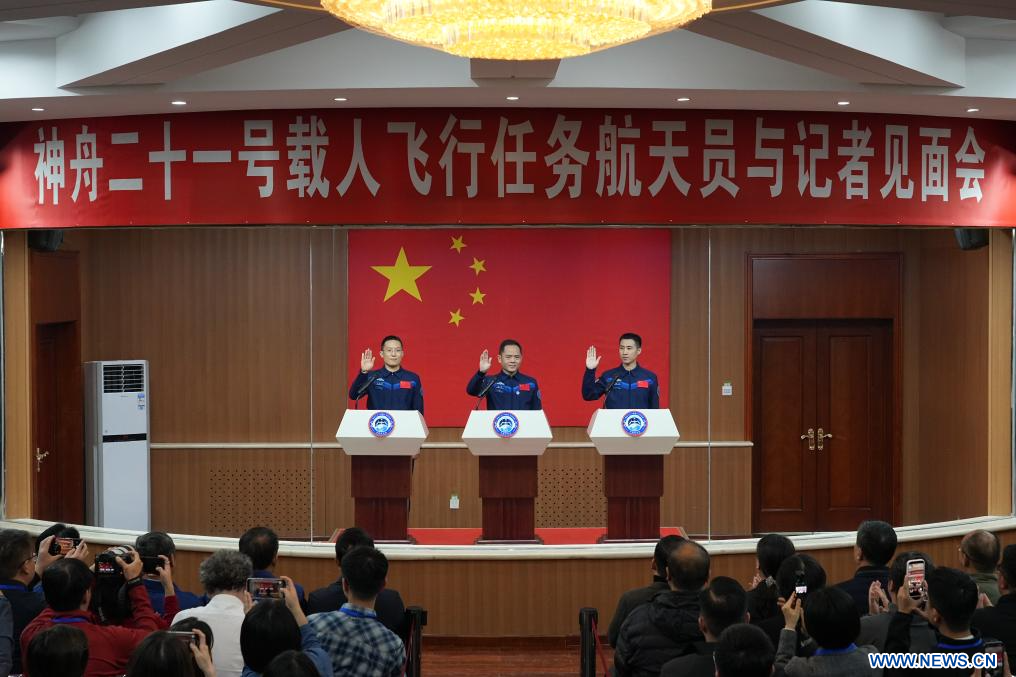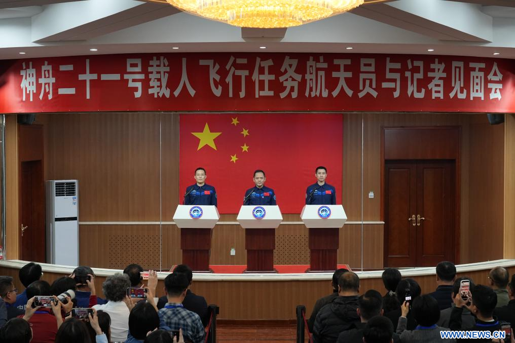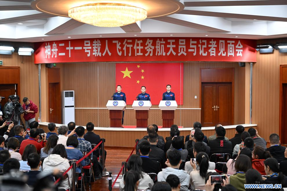 JIUQUAN, 30 octobre (Xinhua) -- Les astronautes chinois Zhang Lu, Wu Fei et Zhang Hongzhang, qui participeront à la mission spatiale prochaine Shenzhou-21, ont rencontré la presse jeudi.