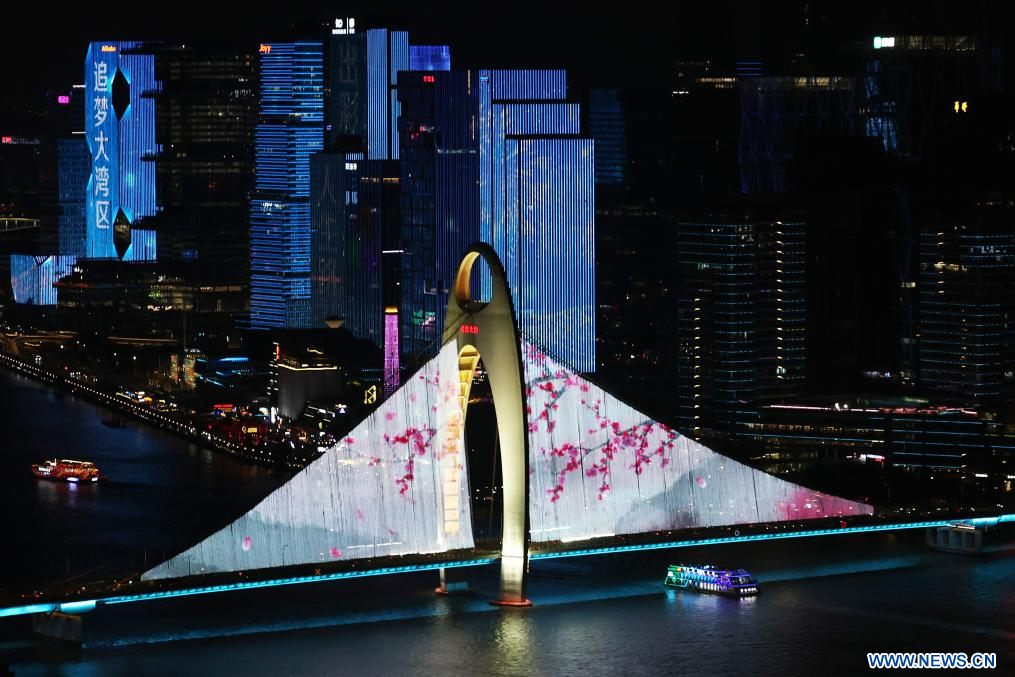 GUANGZHOU, 10 novembre (Xinhua) -- Vue nocturne de Guangzhou, dans la province chinoise du Guangdong (sud), le 9 novembre 2025. La cérémonie d'ouverture des 15es Jeux nationaux chinois s'est déroulée dimanche soir à Guangzhou. (Photo : Wang Kaiyan)