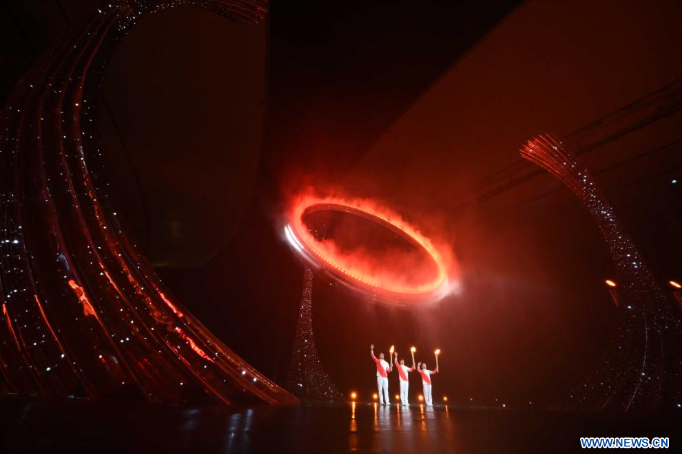 GUANGZHOU, 10 novembre (Xinhua) -- Embrasement de la vasque lors de la cérémonie d'ouverture des 15es Jeux nationaux chinois, à Guangzhou, dans la province chinoise du Guangdong (sud), le 9 novembre 2025. (Photo : Shen Hong)