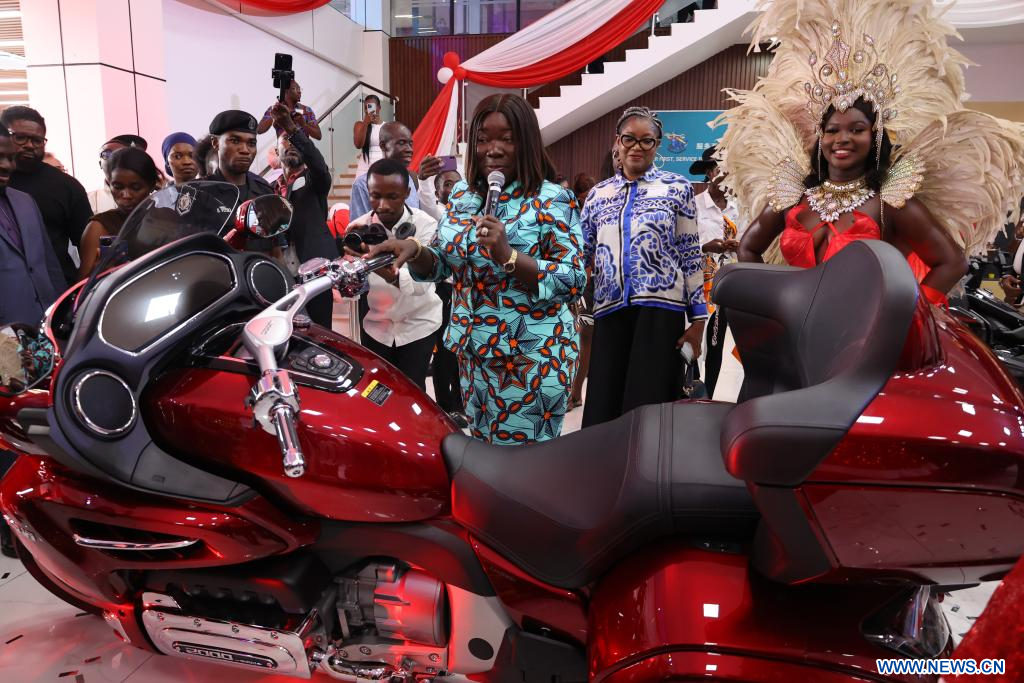 ACCRA, 20 novembre (Xinhua) -- La ministre ghanéenne du Commerce, de l'Agroalimentaire et de l'Industrie, Elizabeth Ofosu-Adjare (au centre), s'exprime lors du lancement de nouveaux modèles de SUV (véhicules utilitaires sport) et de motos du constructeur automobile chinois Great Wall Motor (GWM), ainsi que de la réouverture du showroom Dzorwulu de Zonda Tec Ghana, une société chinoise d'assemblage et de distribution automobile, à Accra, au Ghana, le 18 novembre 2025. (Xinhua/Seth)