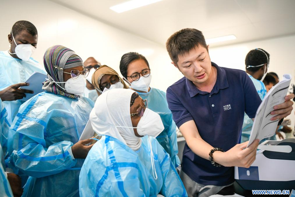 ADDIS-ABEBA, 21 novembre (Xinhua) -- Un formateur chinois échange avec des experts africains dans un laboratoire à Addis-Abeba, capitale de l'Ethiopie, le 20 novembre 2025. (Xinhua/Michael Tewelde)