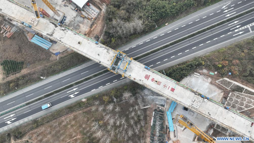 LU'AN, 2 décembre (Xinhua) -- Photo aérienne prise le 2 décembre 2025 montrant le chantier de construction d'un pont de la ligne à grande vitesse Hefei-Wuhan, au-dessus de l'autoroute Shanghai-Chengdu, dans le district de Jinzhai à Lu'an, ville de la province chinoise de l'Anhui (est). D'une longueur de 1.940,57 mètres, ce pont a été achevé mardi.