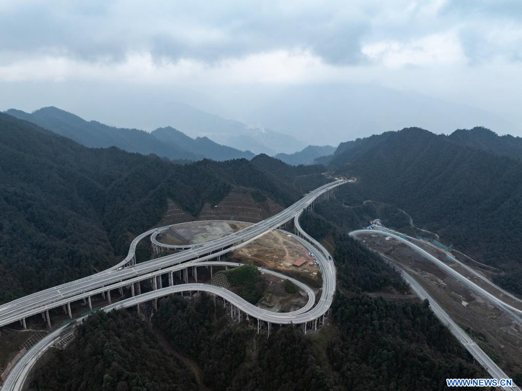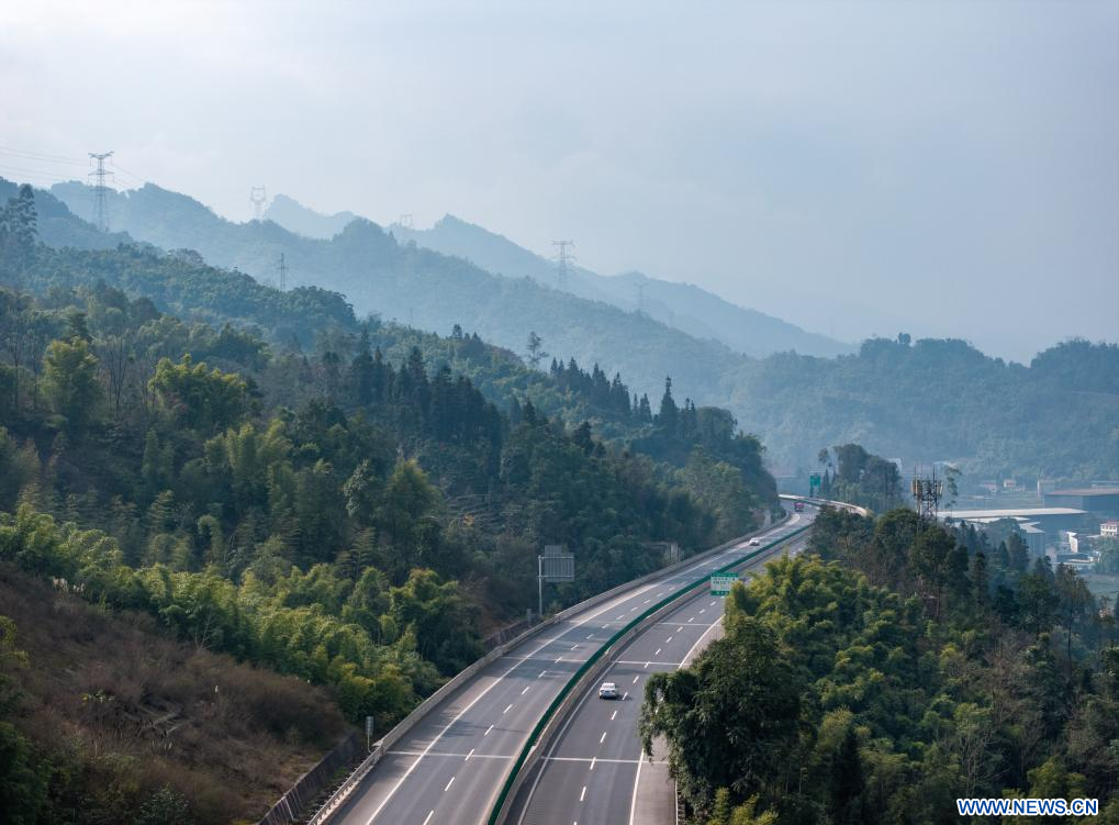 CHENGDU, 1er janvier (Xinhua) -- Vue aérienne d'une section de l'autoroute Leshan-Xichang, dans la province du Sichuan, dans le sud-ouest de la Chine, le 27 décembre 2025.