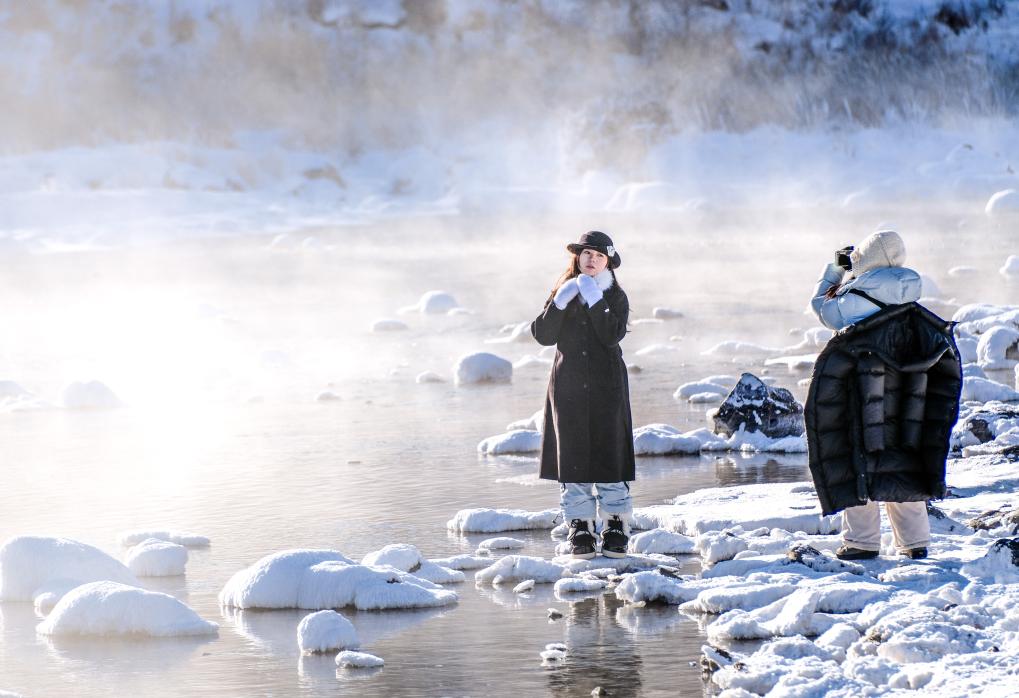 Malgré le froid glacial de l'hiver à Arxan, cette partie de la rivière Halha, influencée par la géothermie, ne gèle jamais, ce qui attire un grand nombre de touristes en hiver. (Photo : Ma Jinrui)