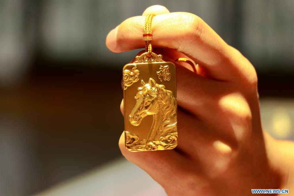 BEIJING, 21 janvier (Xinhua) -- Un produit en or sur le thème de l'année du cheval dans un magasin de la ville de Binzhou, dans la province chinoise du Shandong (est), le 16 janvier 2026. (Photo : Chu Baorui)