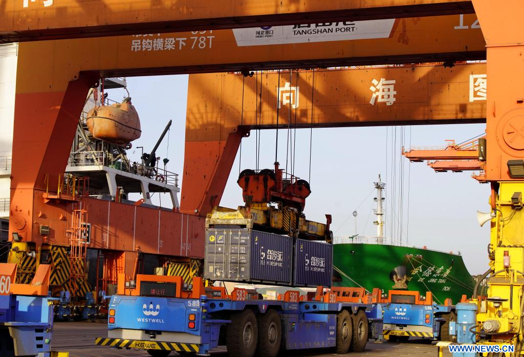 TANGSHAN, 6 février (Xinhua) -- Photo aérienne prise le 5 février 2026 montrant des navires chargés de conteneurs dans un terminal à conteneurs du port de Tangshan, dans la province chinoise du Hebei (nord). Le volume de fret du commerce extérieur dans le port de Tangshan a atteint 381,56 millions de tonnes en 2025, soit une augmentation de 2,59% par rapport à l'année précédente. (Photo : Yang Shiyao)